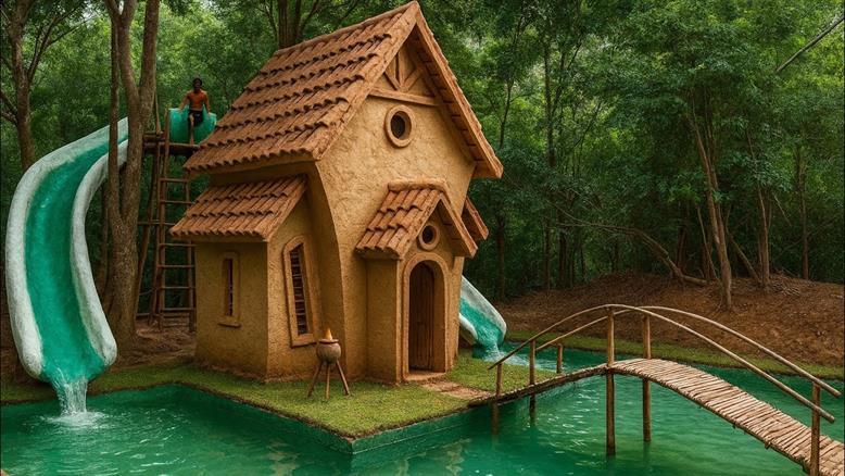 ما شگفتانگیزترین خانه ویلایی گلی و سرسره آبی دوقلو را در اطراف استخر باشکوه میسازیم