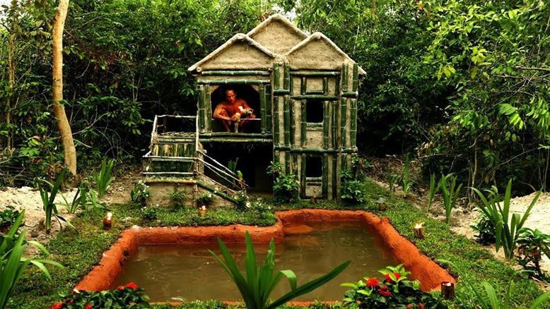 انسان اولیه بامبوی طبیعی ساخت _ خانه گلی با استخر کوچک زیبا