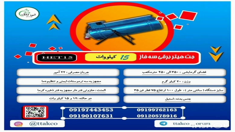 جت هیتر برقی ۱۵ کیلووات سه فاز ، جت هیتر برقی ۱۵۰۰۰ وات ، بخاری برقی ۱۵۰۰۰ وات ، جت هیتر برقی ، هیتر برقی فن دار ، بخاری برقی سه فاز ، جت هیتر برقی ۱۵ کیلو وات ، جت هیتر سه فاز ، جت هیتر برقی سه فاز ، جت هیتر برقی صنعتی ، جت هیتر برقی کوچک ، هیتر موشکی مرغداری ، جت هیتر مرغداری، جت هیتر گلخانه ، هیتر کانکس ، جت هیتر برقی گلخانه ، بخاری برقی فن دار ، بخاری موشکی فن دار برقی ، جت هیتر برقی گلخانه