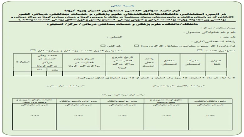 فرم تا˻د سوابق خدمتی مشمولین امتیاز ویژه کرونا
