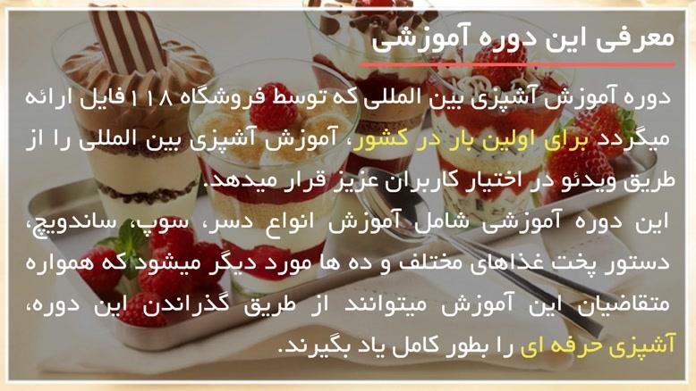 برای اطلاع بیشتر با شماره های 3118 2842-021 ، 09130919446 یا 09130919448 تماس حاصل کرده و یا به وبسایت www.118File.Com مراجعه نمائید. آموزش آشپزی بین المللی با بیش از11ساعت آموزش، انواع سالاد، دسر و ساندویچ راکامل آموزش می دهد همچنین مجموعه آموزش آشپزی بین المللی به آموزش انواع غذاهای سرخ کردنی،گوشتی و انواع غذاهابرای مناسبت های مختلف پرداخته است. لازم به ذکر است مواد اولیه هرغذاوزیرنویس فارسی تمام فایل ها دراین مجموعه موجودمیباشد.