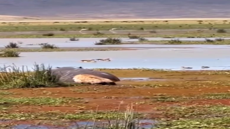 فرار کفتار از دست اسب آبی