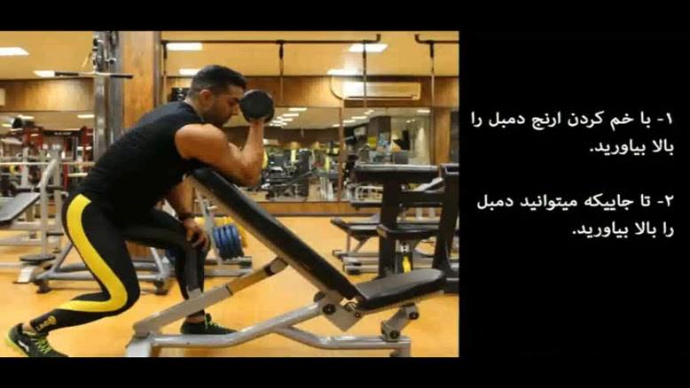 جلو بازو تک دمبل ایستاده روی نیمکت شیبدار