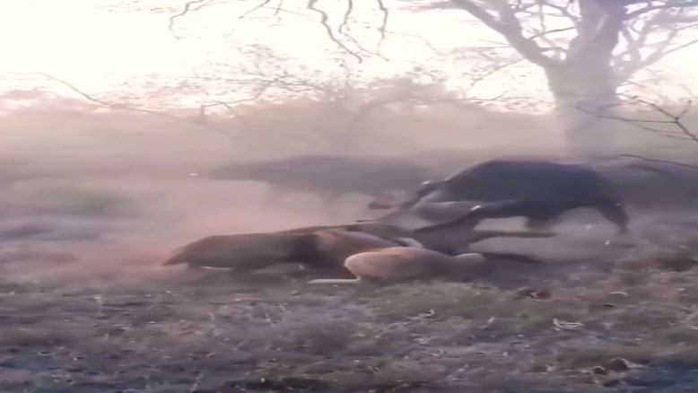 تلاش گاومیش برای نجات فرزندش از چنگ شیر